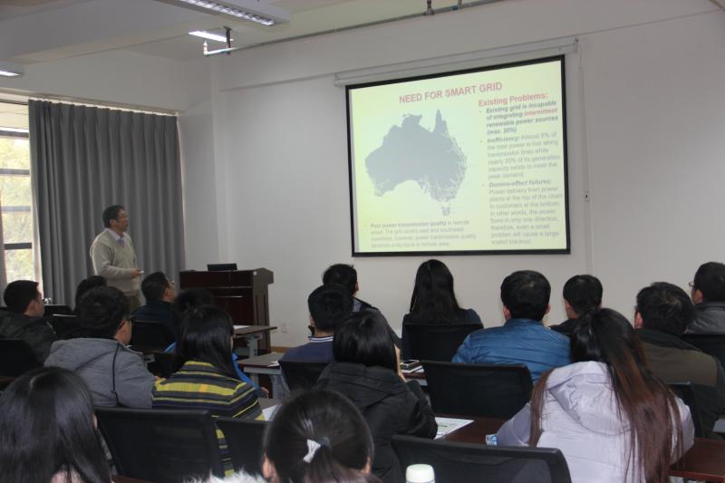张永昌副院长向大家介绍了朱建国教授个人简历,老师和同学们对朱教授的到来表达了热烈的欢迎。接下来朱建国教授介绍了智能微电网中变换器的模型预测控制方法,新能源技术在全世界得到广泛发展的原因,控制方法中所面临的一些挑战以及智能微电网如何与新能源技术结合起来等。此外,朱建国教授还结合自己的科研创新经历,并引用鲜明而又生动的事例,分享了自己多年的研究成果和遇到的问题,为师生们进行了详细而精辟的讲解。