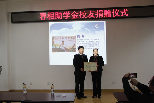捐赠仪式首先由陶森校友讲话,他从回报社会、培养集体荣誉感、奉献爱心三个方面表达了设立春相助学金的初衷和意义,并对将来获得此项助学金的同学提出了希望。