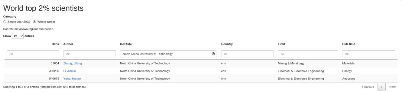 “全球前2%顶尖科学家榜单”分为“终身科学影响力榜单”(关注整个学术生涯迄今的影响力)和“年度科学影响力”榜单(聚焦本年度学术成就)。此次更新的榜单中,我校张立峰、李建林、杨海涛3位教授入选“终身科学影响力榜单”,张立峰、张晓光、杨海涛、李建林、庞中华、郑超等6位教授入选“年度科学影响力”榜单。